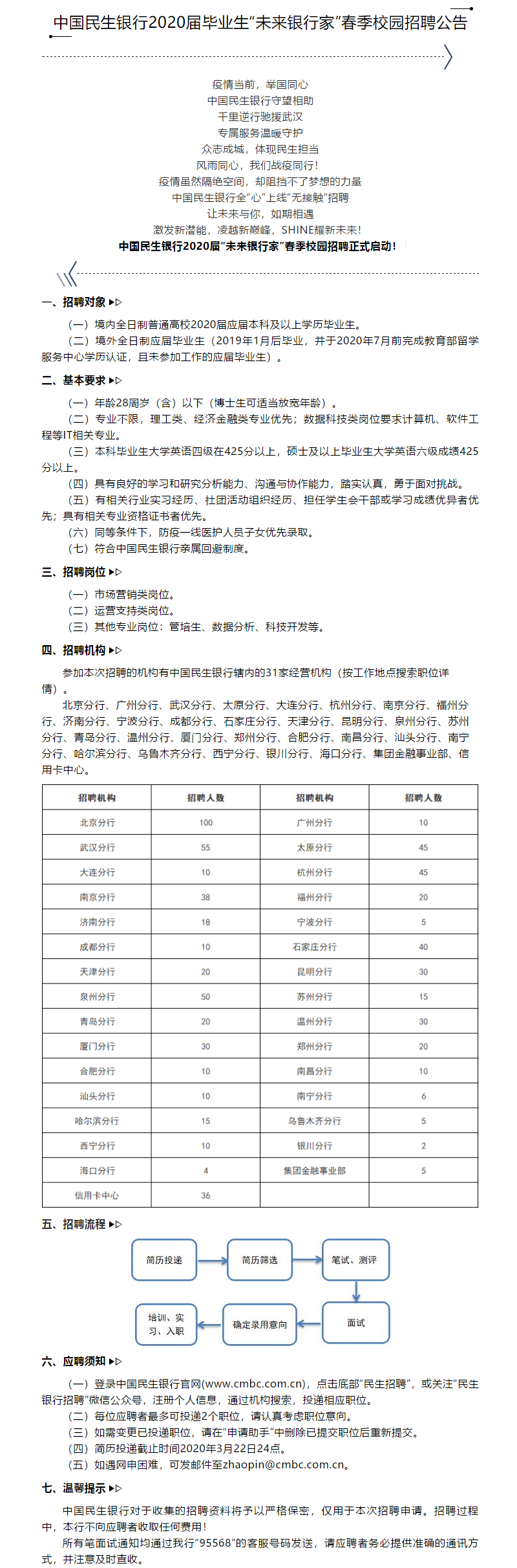 中国民生银行2020届毕业生“未来银行家”春季校园招聘公告
