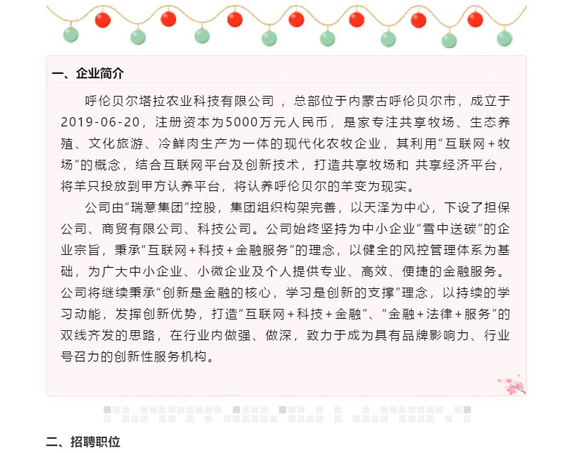呼伦贝尔塔拉农业科技有限公司企业招聘启事