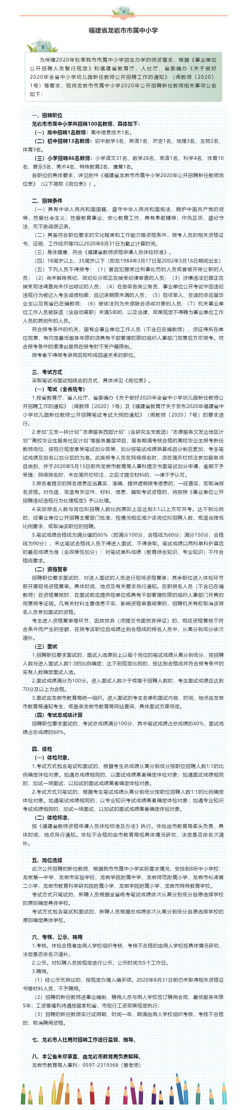 福建省龙岩市市属中小学2020年公开招聘新任教师