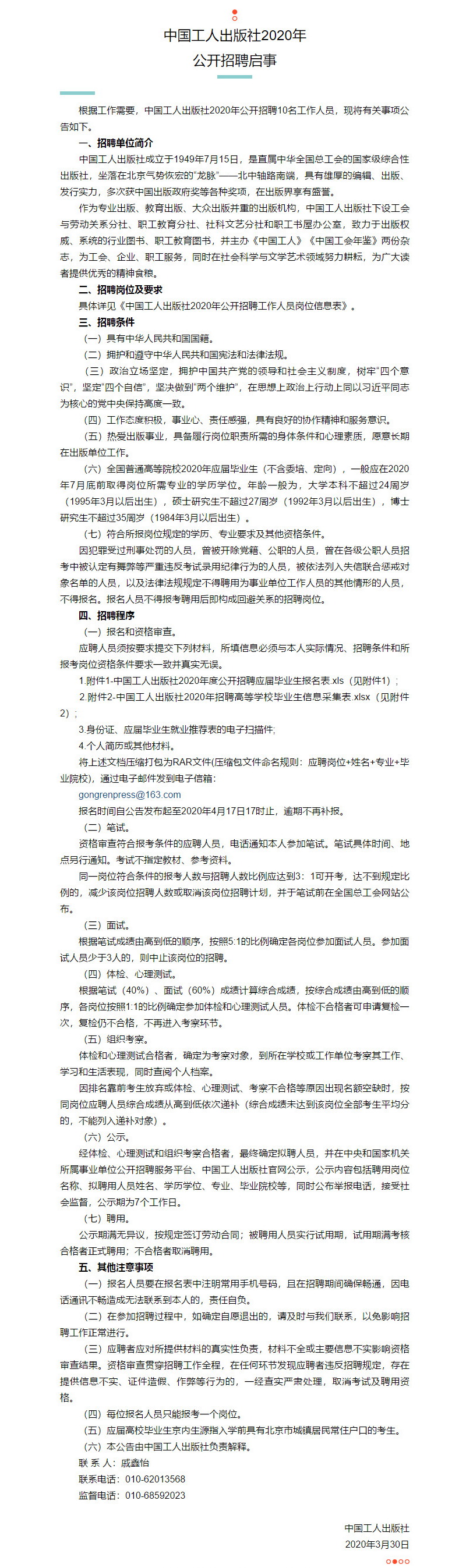中国工人出版社2020年招聘
