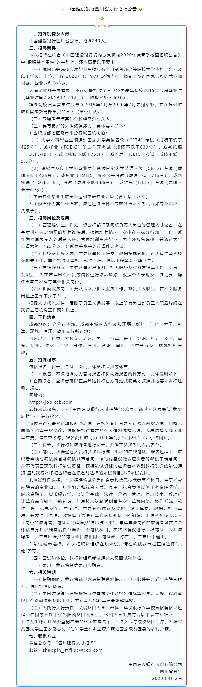 中国建设银行四川省分行招聘