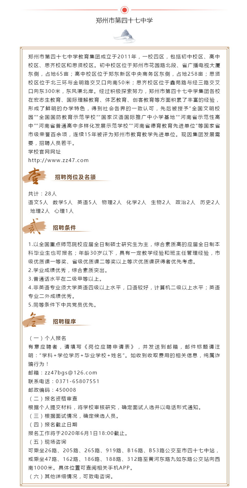 郑州市第四十七中学招聘