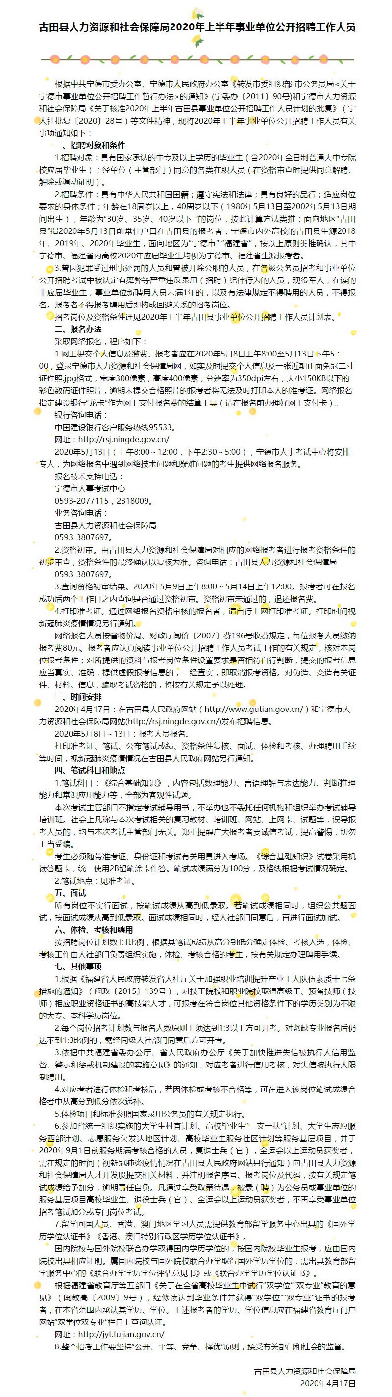 福建省宁德市古田县人力资源和社会保障局事业单位公开招聘工作人员