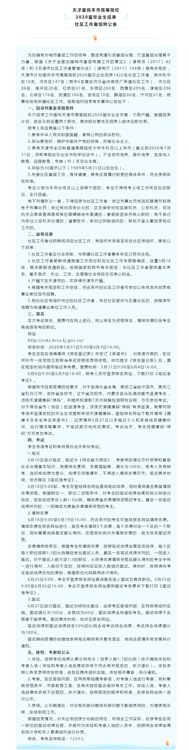 天津面向本市高等院校2020届毕业生招录社区工作者
