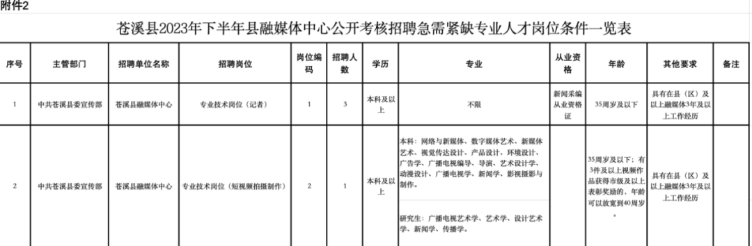 苍溪县融媒体中心公开考核招聘事业单位工作人员4名,具体包括记者岗3名、短视频拍摄制作岗1名。