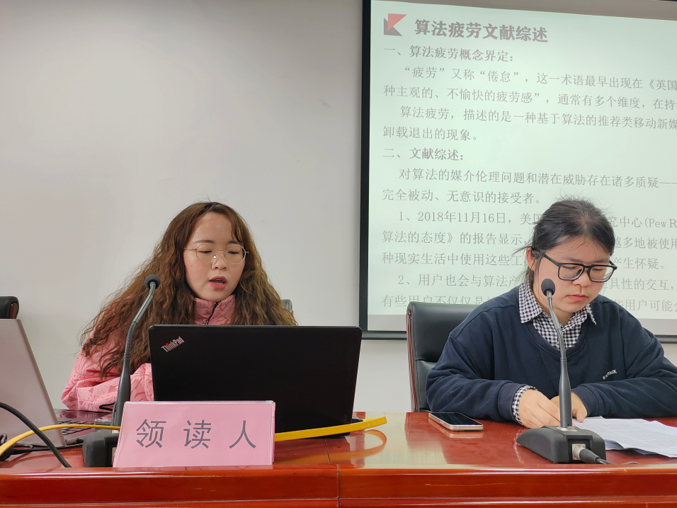 4月6日中午12点30分,本学期第四期“青享”读书会在图书馆C区213举行。2022级新闻学硕士研究生谭天颖和董佳丽两位同学分别领读了《移动新媒体用户算法疲劳影响因素研究》和《立场、情感、注意力与选择性接触:舆论极化的影响要素分析》两篇论文。韩诚老师和林靖老师为本次读书会的指导老师,读书会由2022级新闻学硕士研究生刘应馨主持。