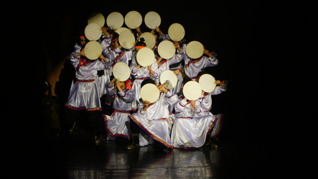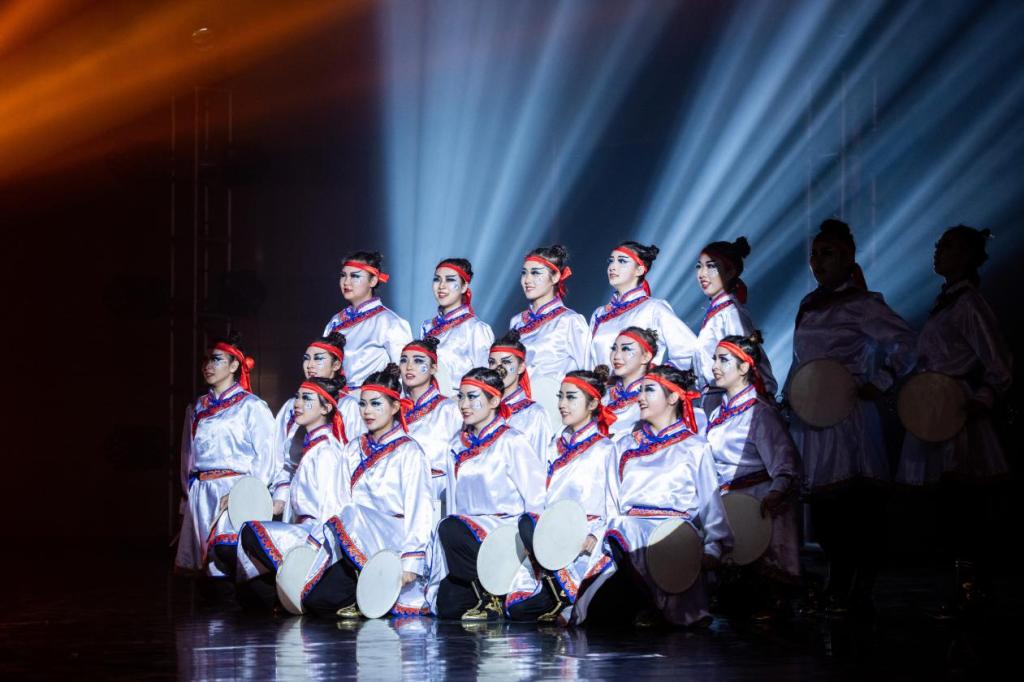 表演的最后,演员们跳起击鼓,鼓声整齐有力,象征着蒙古族人民坚韧的心性。虽然现在身处和平,但他们会永远铭记一代代先辈传承下来的勇敢精神,不忘初心,砥砺前行。音乐结束的那一刻,所有演员霎时定格在原地,齐齐望向领舞,蒙古族人民将在党的领导下迈入新时代。