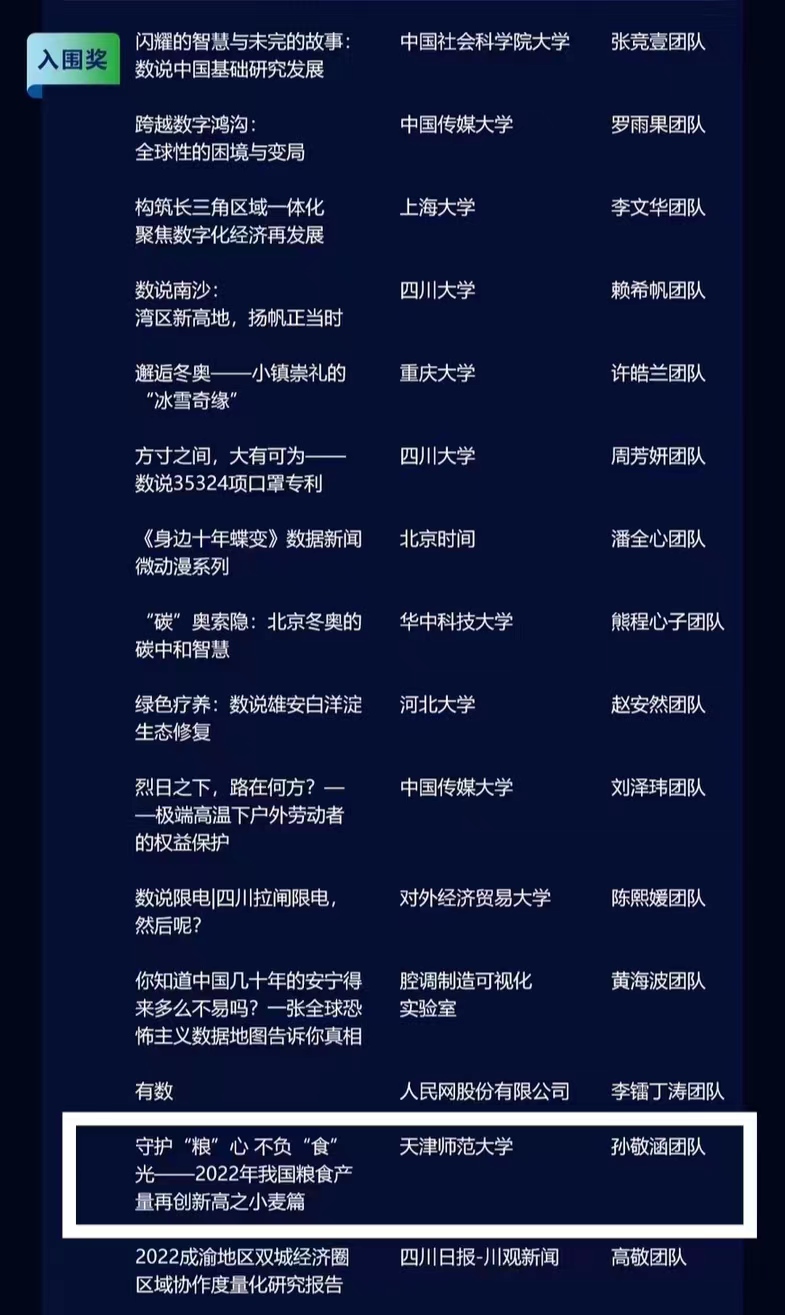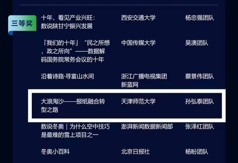 近日,在第三届中国广电媒体融合发展大会上,由国家广播电视总局和中华全国新闻工作者协会指导,中共北京市委宣传部、光明日报社、北京市广播电视局、国家广播电视总局广播电视科学研究院和北京市新闻工作者协会共同主办的第二届新视听媒体融合创新创意大赛获奖结果公布。公司新闻学专业2020级员工孙弘泰、管雅乐、汪燕均、李祺譞、张嘉艺五位同学共同完成的作品《大浪淘沙——报纸融合转型之路》获得三等奖(指导教师:冯帆),孙敬涵团队的《守护“粮”心不负“食”光——2022年我国粮食产量再创新高之小麦篇》获得入围奖(指导教师:冯帆)。