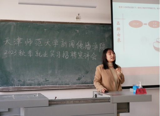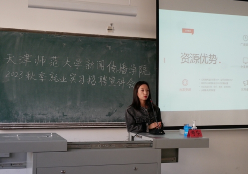 天津新偶文化传媒有限公司运营主管王晓莲从关于我们、业务概况、项目案例、招募岗位四个方面进行宣讲,通过现有的多元业务板块与多领域的内容生产展现企业风格,以贴近专业、贴近员工的角度介绍了与公司专业对口的岗位需求。