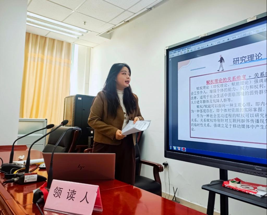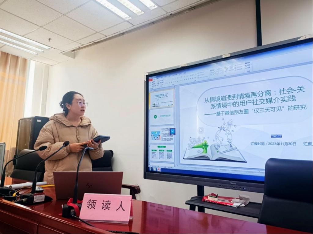 11月30日中午12点30分,本学期第四期“青享”读书会在图C213召开,主题为“微信空间中的自我呈现”。本期领读人为2022级广播电视艺术学张柯和2022级传播学李锦洋,指导老师为孙卫华教授和林靖副教授,2023级传播学赵赢硕担任主持人。
