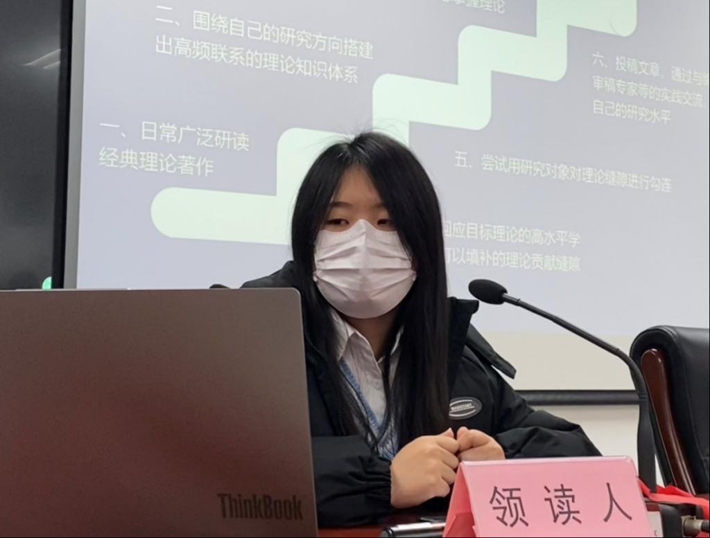 赵心宝同学以领读文章的框架为基础,向大家介绍了青年新闻传播学者应具备的六大学术规划意识。通过对学术规范意识、回应理论意识、跨越学科意识、团队合作意识、身份符号意识以及时代使命意识的介绍,为研究生同学规范论文写作、聚焦研究方向、确立学科核心研究领域以及养成良好的研究习惯等方面带来了启发。