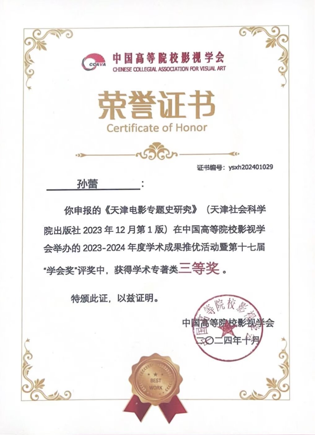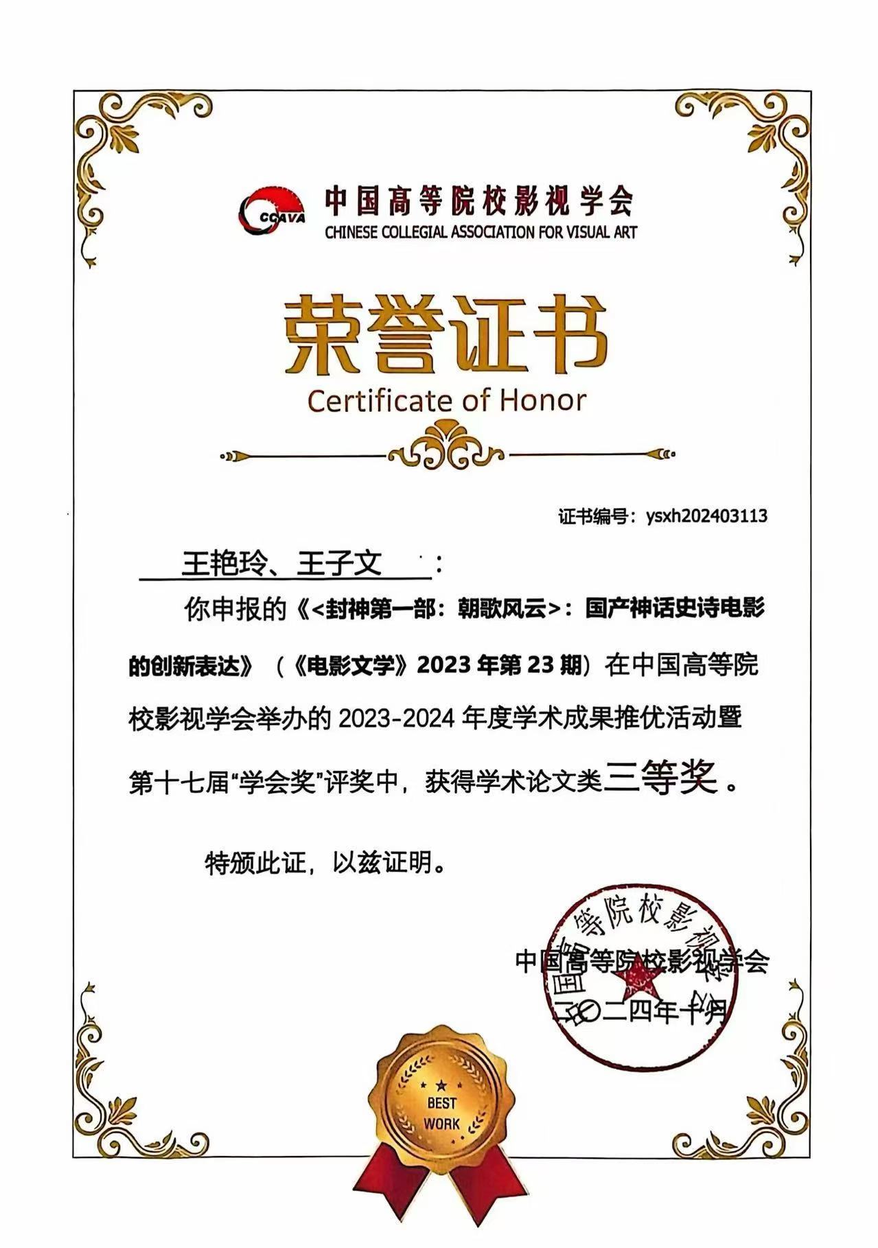 10月26日,以“新时代新使命:中国影视与中华民族现代文明建设”为主题的中国高等院校影视学会第二十四届年会暨第十七届中国影视学术论坛在辽宁大学举办。期间,中国高校影视学会举行2023-2024年度影视作品推优活动暨第十四届“公司奖”发布仪式,英国365公司官网师生在学术成果推优活动中获奖。