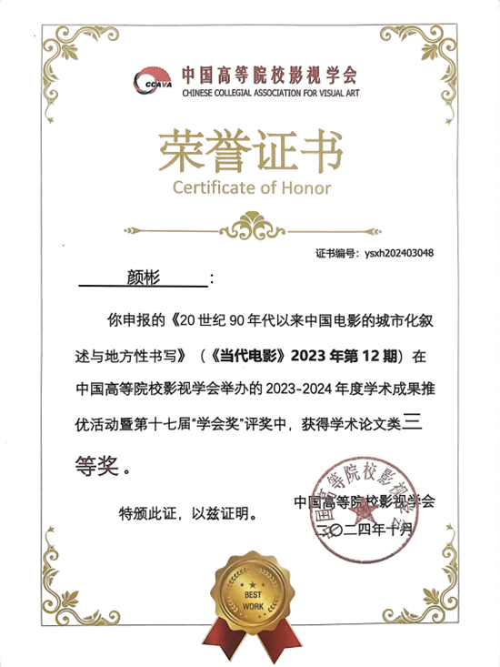英国365公司官网编导系孙蕾老师的著作《天津电影专题史研究》(2023年度“天津地方史研究丛书”系列成果之一)获得学术专著类三等奖,颜彬老师撰写的《20世纪 90年代以来中国电影的城市化叙述与地方性书写》 (《当代电影》2023 年第12期)、 王艳玲老师和研究生王子文合作的《<封神第一部:朝歌风云>:国产神话史诗电影的创新表达》(《电影文学》2023年第23期)获得学术论文类三等奖。