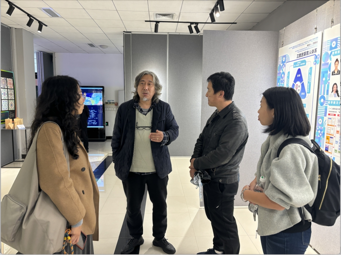 座谈会后,赵世勇经理现场展示了人工智能与科技艺术协同创新平台的云工作站大模型平台相关操作,介绍了《节气灵兽》创意作品、AI数字人和一系列产教融合产品。调研一行还参观了天津商务职业公司广告公司协同创新中心,交流了AIGC实践教学情况。