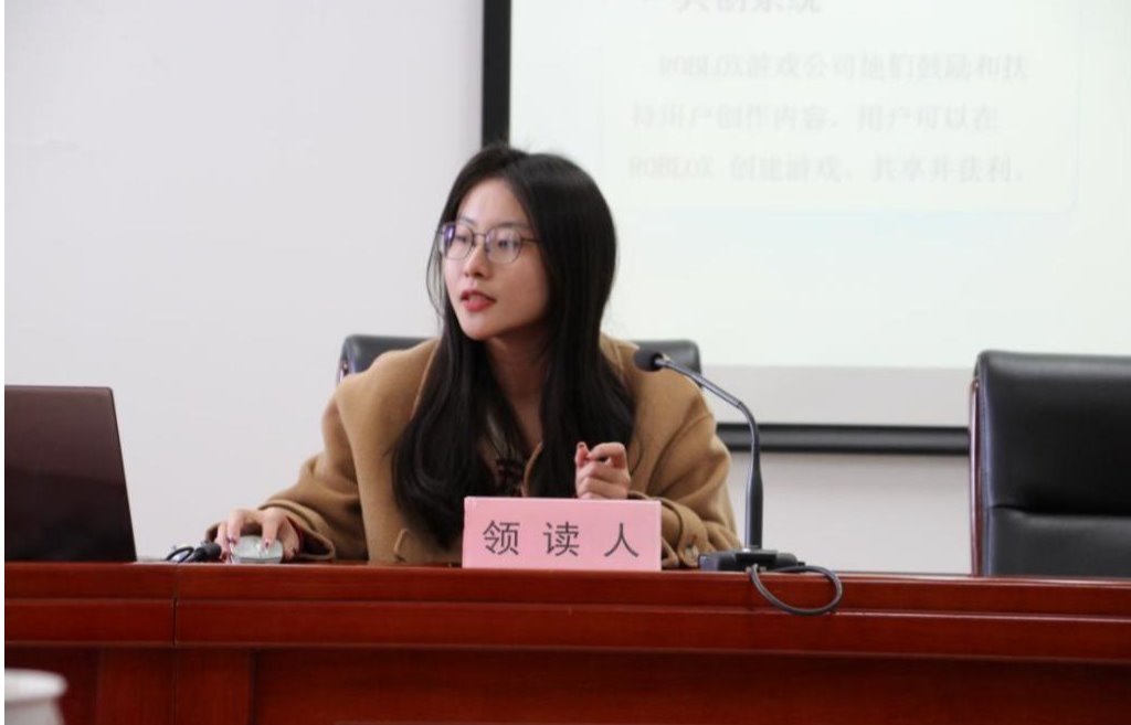段向阳同学从领读论文的研究背景、研究内容、研究意义和研究启示四方面进行讲解。首先,她从社会、技术和结果方面入手,展现了人类进入元宇宙时代的研究背景;接着从元宇宙、体验设计、身份编辑和时空生产四方面讲述其研究内容;随后又从研究意义和研究启示两方面展现了元宇宙具有的积极意义和发展元宇宙的新视角、新启示。