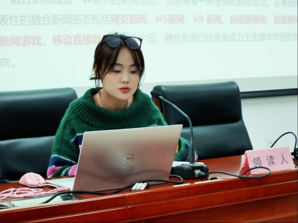 何姿岳同学围绕领读文章先提出了三个关键词:可能世界、融合新闻以及互动叙事,并根据这三个关键词简要分析了它们的界定、应用以及联结方式。基于此,她又从“互动性何以影响叙事性”这一问题出发,揭示在融合新闻的叙事命题下,现实在互动维度的存在形式及表征语言,后又根据“融合新闻”这一文本形式分别探讨了互动发生的数字装置和三重维度。
