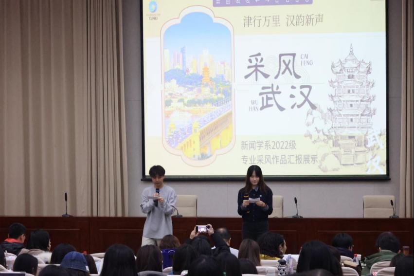 参加展示的七个小组各展风采,每组围绕选题进行了10分钟的现场展示。上半场聚焦交通文旅类选题:“过桥米线小组”关注鹦鹉洲长江大桥,借《鹦鹉洲十年记——“桥”见酸甜苦辣》主题深挖桥梁背后故事;“解放桥组”受《归来》启发,通过亲身体验解放桥下商贩的生活,呈现解放桥旅游经济的发展;“疯狂星期九”小组以电台接听来电形式,在《民园奇遇记》主题下巧妙地将个人故事与民园广场的历史相融合;“津天鄂了么”小组以黄鹤楼为线索,用诵读、视频等多种形式带来跨越时空的视听盛宴,展现黄鹤楼古韵与城市发展。
