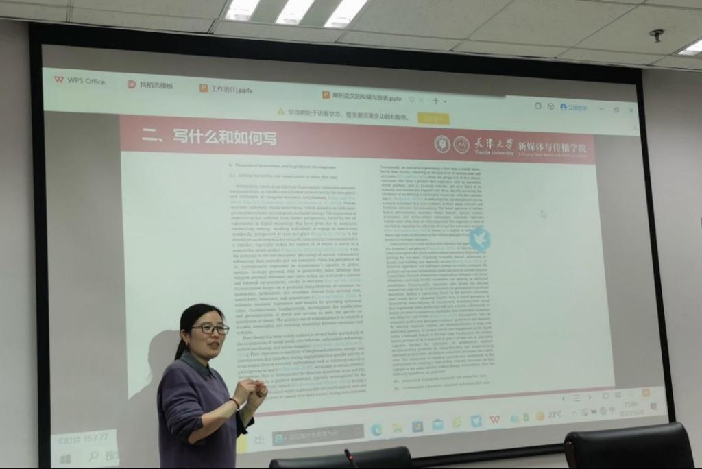 在交流会上,庞华教授从五个方面系统讲解了英文SSCI论文写作的核心要点:写作前的准备工作、选题与写作方法、目标期刊的选择、投稿信的撰写技巧以及投稿后的沟通与修改策略。她特别强调,英文论文写作与中文论文写作有共通之处,都需要具备“庖丁解牛”的思维,从文献的共性出发,梳理逻辑脉络,化整为零,逐步构建论文框架。庞华教授还分享了如何从日常研究中挖掘创新英文论文选题的“小巧思”,并深入剖析了论文写作的“三驾马车”。她以生动的比喻形容论文写作过程:“写英文论文就像做雕塑,需要不断打磨,直到它成为一件艺术品。”这一形象的比喻激发了在场教师的共鸣,也鼓舞了大家尝试向国际期刊投稿的信心。