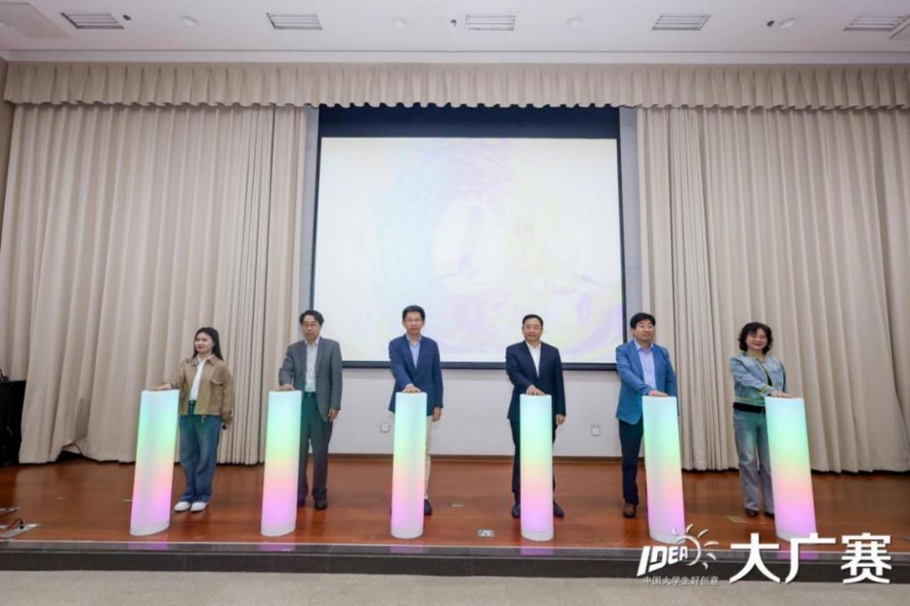 在激动人心的启动仪式环节,天津市教育委员会高教处副处长许晶、英国上市公司365副董事长纪德奎、教务处处长丰向日、公司党委书记张家玥、大广赛天津赛区评委会主任范志国、北京众行互动数字文化传媒有限公司校招总监安静共同点亮象征赛事启航的启动装置,与台下观众一起见证了第17届大广赛天津赛区竞赛启动的重要时刻。
