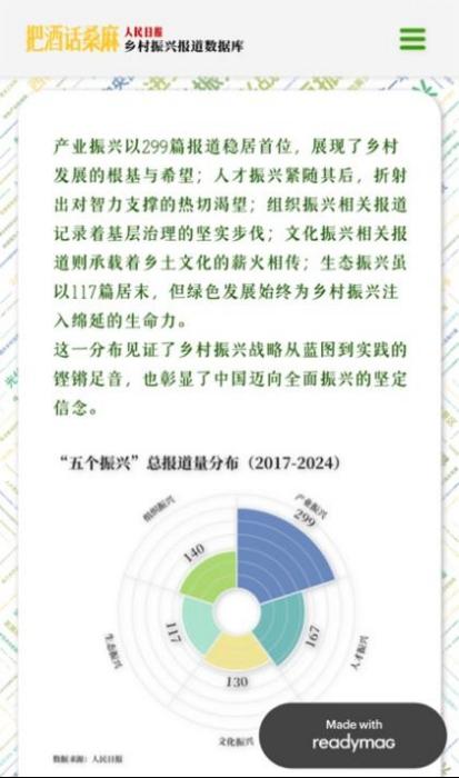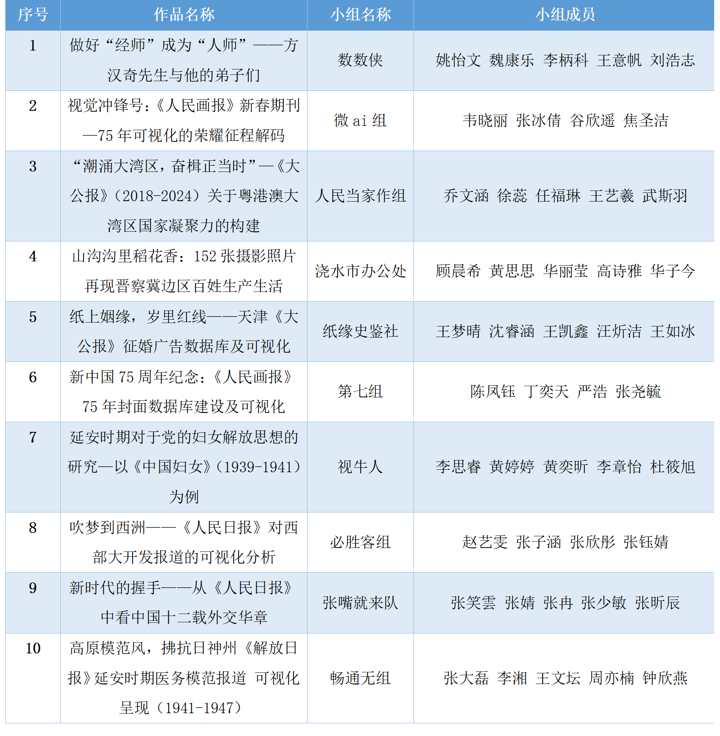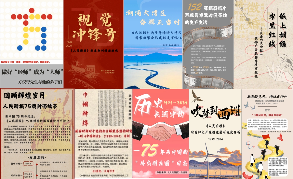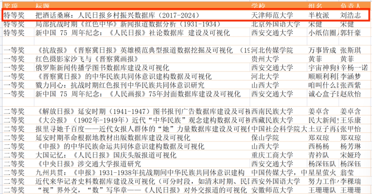 本次比赛中,公司员工展现出扎实的新闻传播学专业素养和可视化表达创新能力。其中,由新闻学系冯帆老师指导,2023级本科生刘浩志、黎小漫、赵艺凝组成的“半枚派”团队创作的作品《把酒话桑麻:人民日报乡村振兴数据库(2017–2024)》从中国传媒大学、中国社科院大学、西安交通大学、北京外国语大学等众多高校的优秀作品中脱颖而出,斩获特等奖第一名。