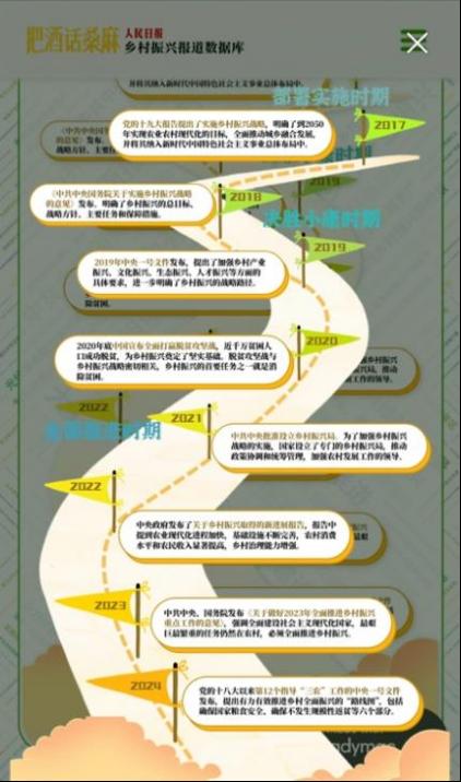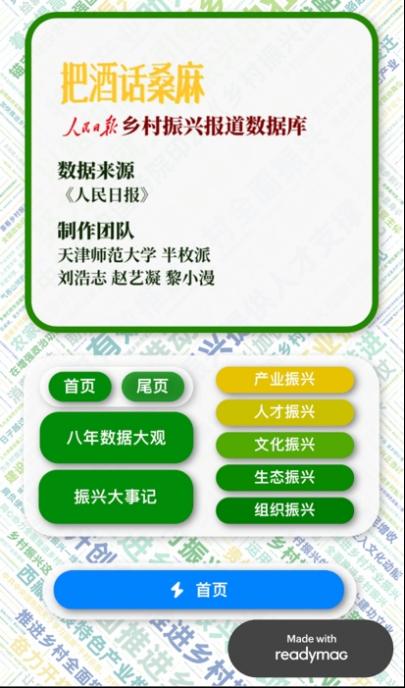 该作品围绕“乡村振兴”主题,抓取了《人民日报》中标题含有“乡村振兴”的1792篇报道,搭建出一套结构清晰、信息丰富的数据库系统。作品以乡村全面振兴的五个方面为抓手,以总—分结构展开,用可视化数据展现出《人民日报》对乡村振兴的长期关注。在作品的形成过程中,该团队成员综合运用数据挖掘技术、数据可视化技术以及人工智能技术,对报道进行语义分析和视觉优化呈现出乡村振兴进程中涌现的典型案例。该作品生动形象地展现了党报在政策传播、议题设置与话题聚焦中的重要作用,获得专家评委一致好评。