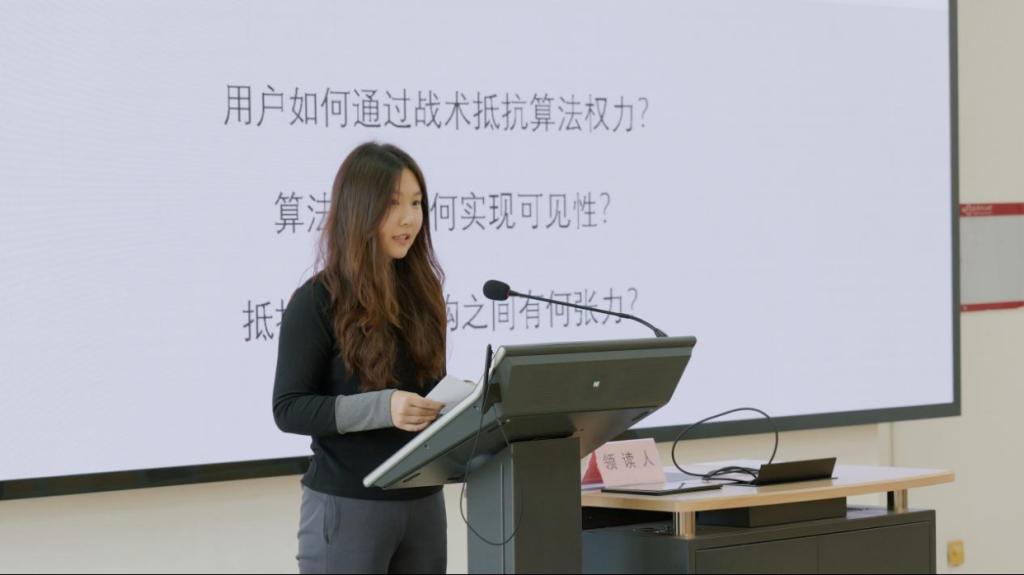 与迟莞琦同学分享的内容相应,王姿元同学从生活热点入手,依托领读论文带领大家领略算法机制所产生的权力以及用户的抵抗。当前,算法权力主导数字社会,控制“可见性”;用户则通过算法抵抗争夺“被看见”的可能性。在算法权力的笼罩下,普通用户通过灵活的战术实践,能够开展一种富有生机的游牧式算法抵抗。这种抵抗虽无法从根本上颠覆算法权力结构,但通过争夺算法可见性来争取社会承认与普遍正义。此次分享我们可以了解到,尽管力量微弱,但用户抵抗仍具有改写权力格局的潜能。