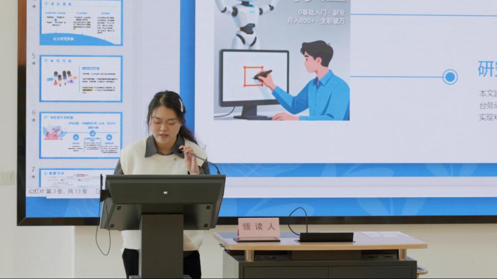 迟莞琦同学根据领读论文围绕“算法——关系——中介”三维维度,深入拆解了平台劳动过程混合控制框架的搭建逻辑与核心路径。借助领读论文她深刻分析了AI浪潮下“数字民工”践行看似自由弹性的工作,实则存在难以摆脱资本混合控制的困境。除此之外,迟莞琦同学还重点分享了技术是如何超越传统“平台——劳动者”的点对点控制、形成“平台——中介机构——劳动者”的新型控制架构的。最后,她发起倡议:作为新闻与传播研究者,我们应该将目光放远,聚焦于技术光环下的人们而非仅技术本身,从而更好地讨论与分析社会议题。
