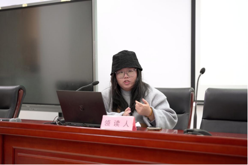 会上,两位同学的领读展示成为核心亮点。王一迪同学在领读中以“河北涞源反杀案”为线索,引导大家进入论文的研究逻辑。她带领同学们回到数据与模型的层面,梳理研究如何利用57,563条微博数据与ARIMAX模型,逐步推演出“道德愤怒”在社交媒体中的学习与扩散机制。在讲解核心观点时,她重点呈现了论文如何通过“情绪共同体”“观察—奖励机制”等关键概念,构建情绪传播的深层框架,使同学们得以清晰把握研究背后的理论支点与逻辑链条。