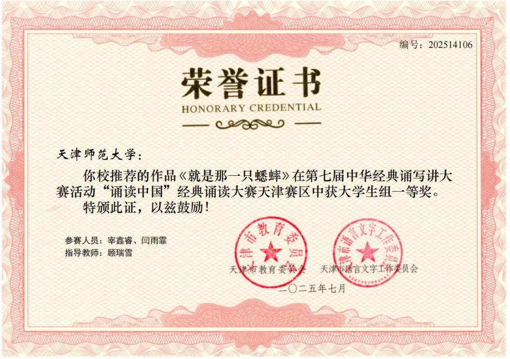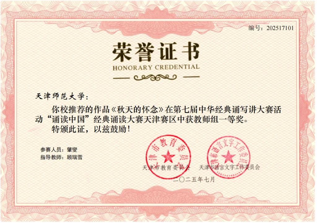 作品《秋天的怀念》(指导教师:顾瑞雪,参赛教师:肇燮)荣获天津市一等奖。肇燮老师以扎实的专业素养与饱满真挚的情感诠释,将史铁生笔下的沉静哀思与坚韧力量层层铺展。声音的抑扬顿挫间,透出对作品内核的深刻洞察——那不仅是怀念母亲、感怀生命的个体叙事,更是对苦难中人性光辉的温柔凝视。其诠释不仅体现了语言的感染力,更展现出教育工作者对文学精神的深入理解与传承使命,令聆听者在声音与文字的共鸣中,重新走进那段关于爱、遗憾与重生的经典篇章。