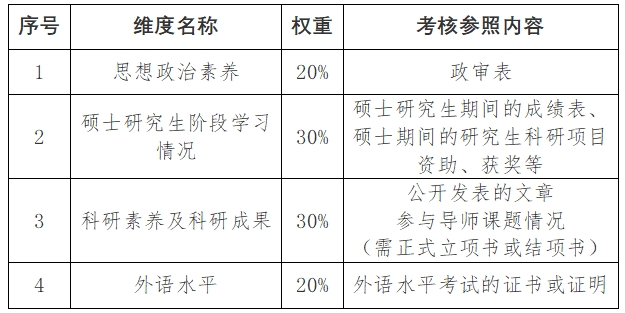 考核维度包括:思想政治素养、硕士研究生阶段学习情况、科研素养及科研成果、外语水平。各维度的权重及考核参考内容如下: